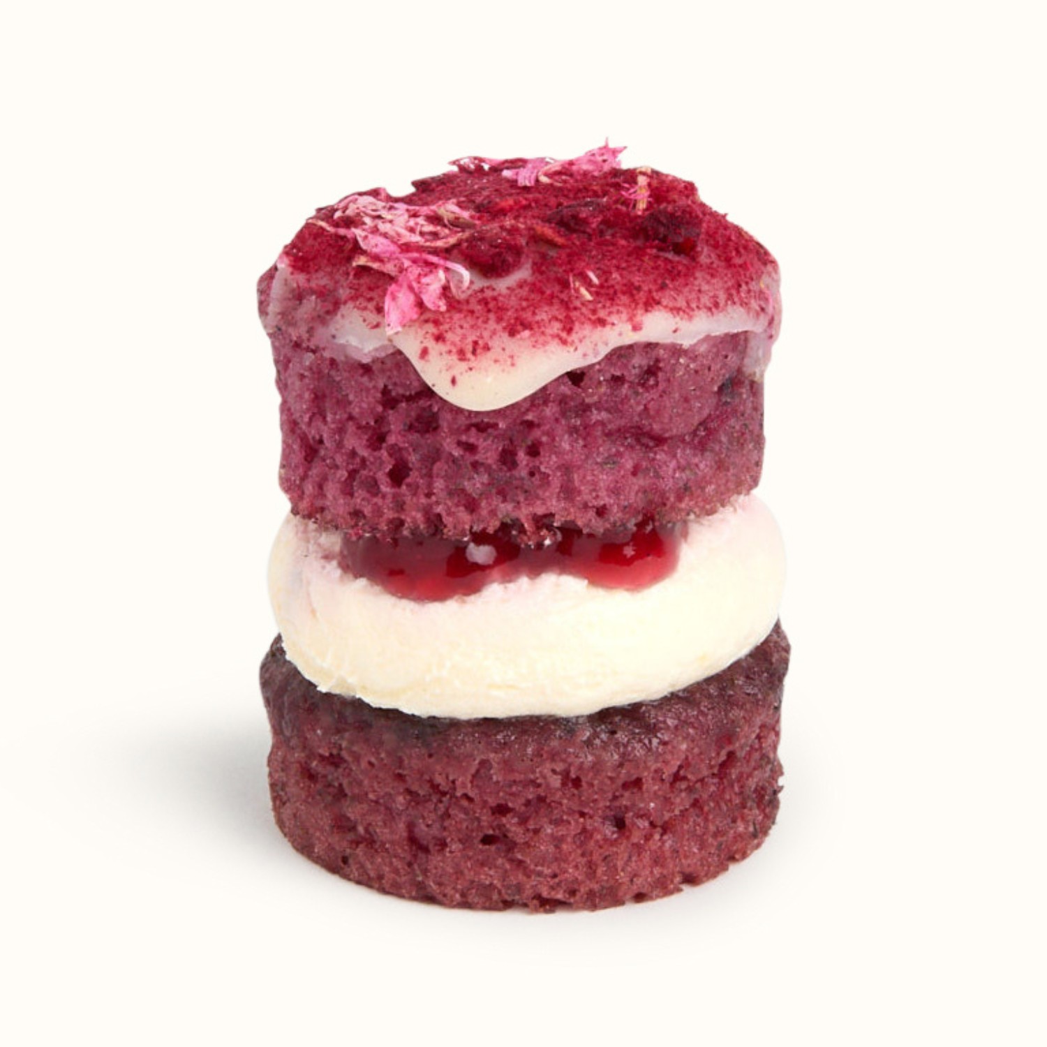 Sugar, Wheat Flour (Wheat Flour, Calcium Carbonate, Iron, Niacin, Thiamin), Soya Yogurt (Water, Soya Beans, Natural Flavouring, Sea Salt, Vitamins B12, D2, Live Cultures (S. Thermophilus, L. Bulgaricus)), Liquid Chickpea Extract, Rapeseed Oil, Salted Vegan Butter (Plant Oils (Sunflower, Rapeseed), Coconut Oil, Water, Sea Salt, Faba Bean Preparation, Emulsifier (Sunflower Lecithin), Natural Flavouring, Colour (Carotenes)), Raspberry Jam (3.6%) (Glucose Syrup, Sugar, Raspberry Puree, Gelling Agent (Pectin), Acidity Regulators (Citric Acid, Trisodium Citrate), Colour (Anthocyanin), Flavouring), White Chocolate Alternative (3.6%) (Cocoa Butter, Rice Powder (Rice Syrup, Rice Starch, Rice Flour), Sugar), Soya Drink (Water, Soya Bean), Humectant (Vegetable Glycerine), Freeze Dried Raspberry (1.2%), Raising Agents (Disodium Diphosphate, Sodium Hydrogen Carbonate), Wheat Starch, Cornflour, Natural Flavouring, Colour (Beetroot Red).